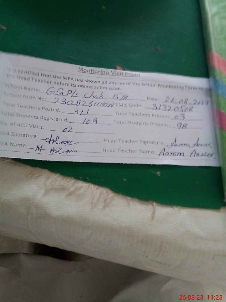 | Attendance Register | Head Teacher | MEA with School | Visit Proof |
