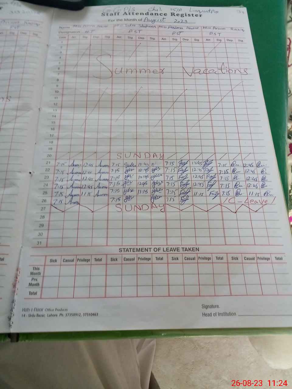 | Leave | Duty | Absent | Maternity | Medical | Ex- Pak |
