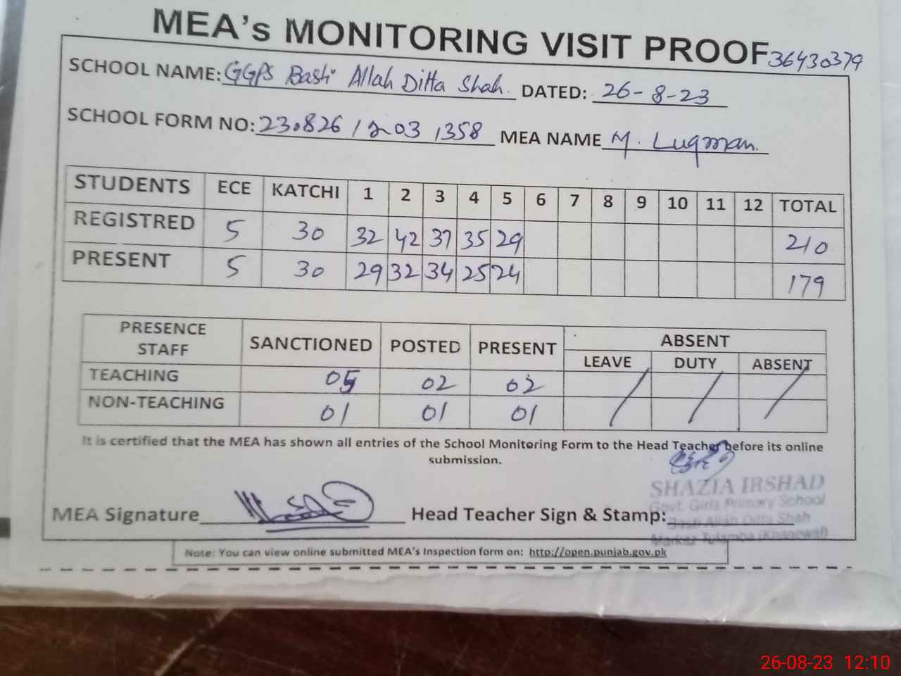 | Certified that this School was Inspected by the Undersigned MEA/DMO Today and the Information Stated Above is as Per Record. | |||||