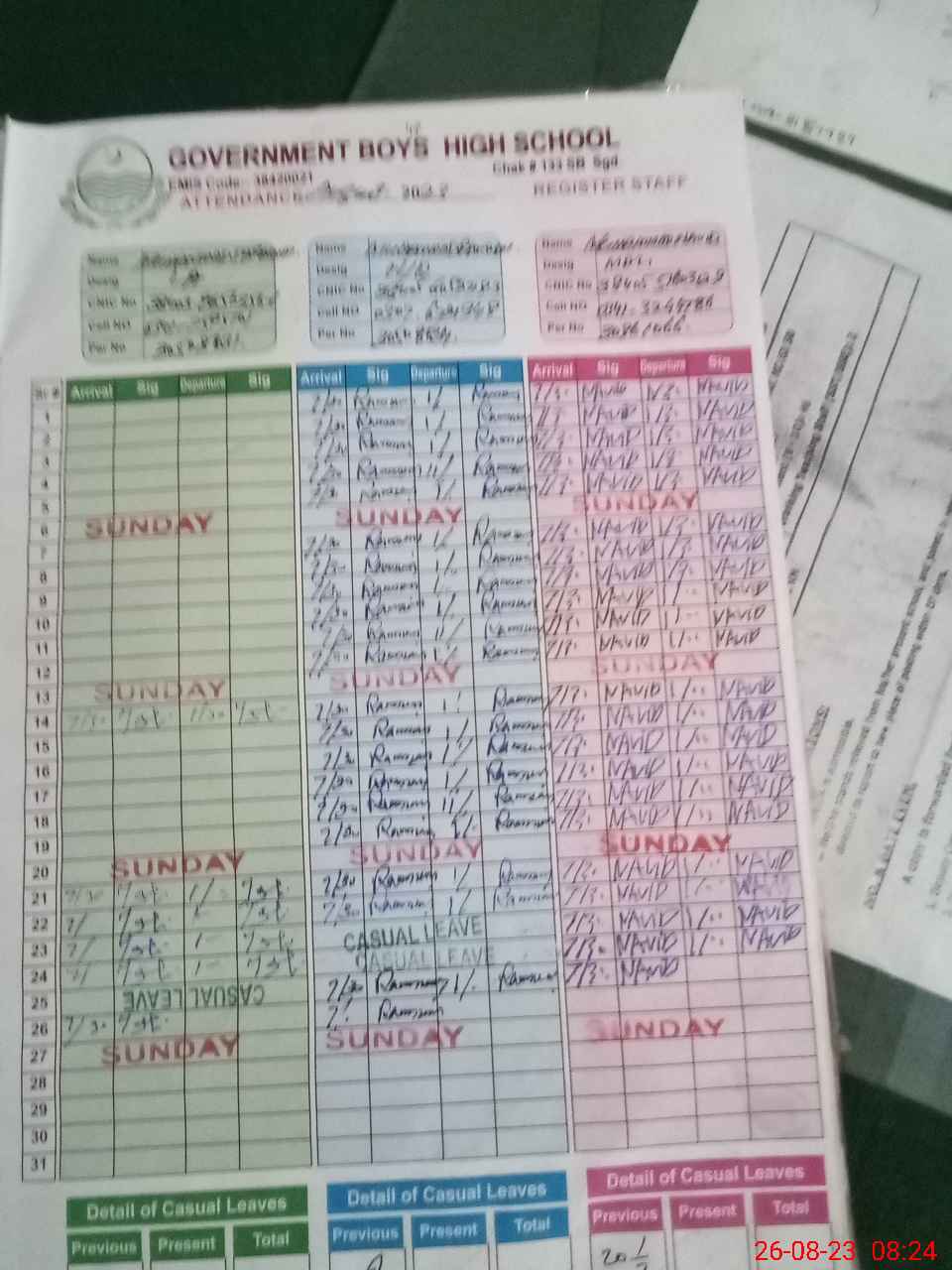 | CNIC | Full Name | Designation | R/C | Absence during last cal. month |