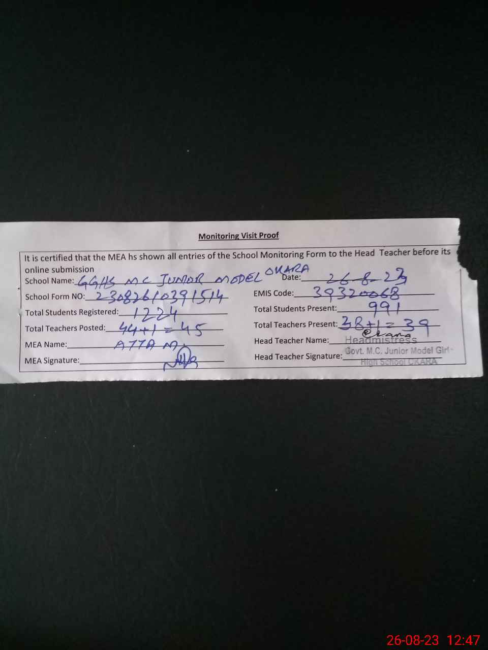 | Attendance Register | Head Teacher | MEA with School | Visit Proof |