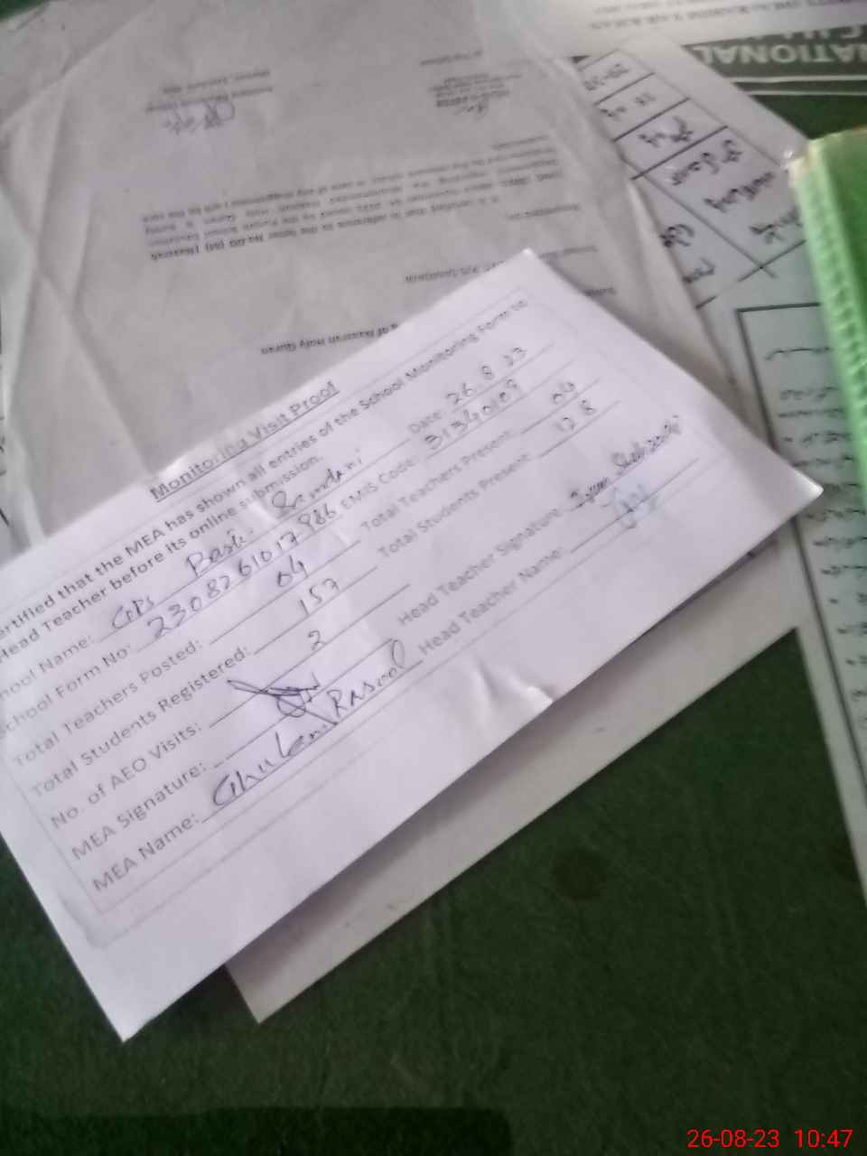 | Attendance Register | Head Teacher | MEA with School | Visit Proof |