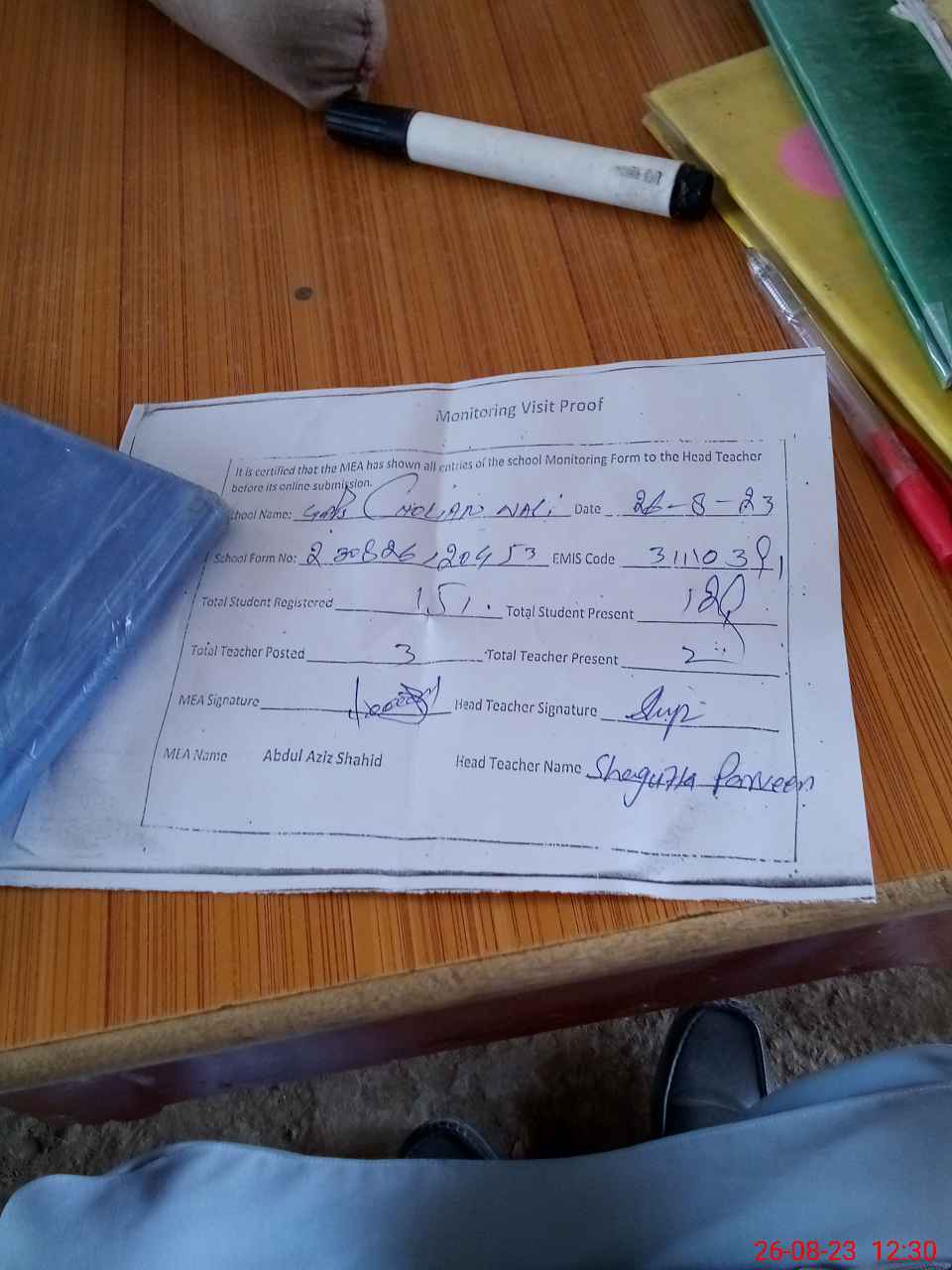 | Attendance Register | Head Teacher | MEA with School | Visit Proof |