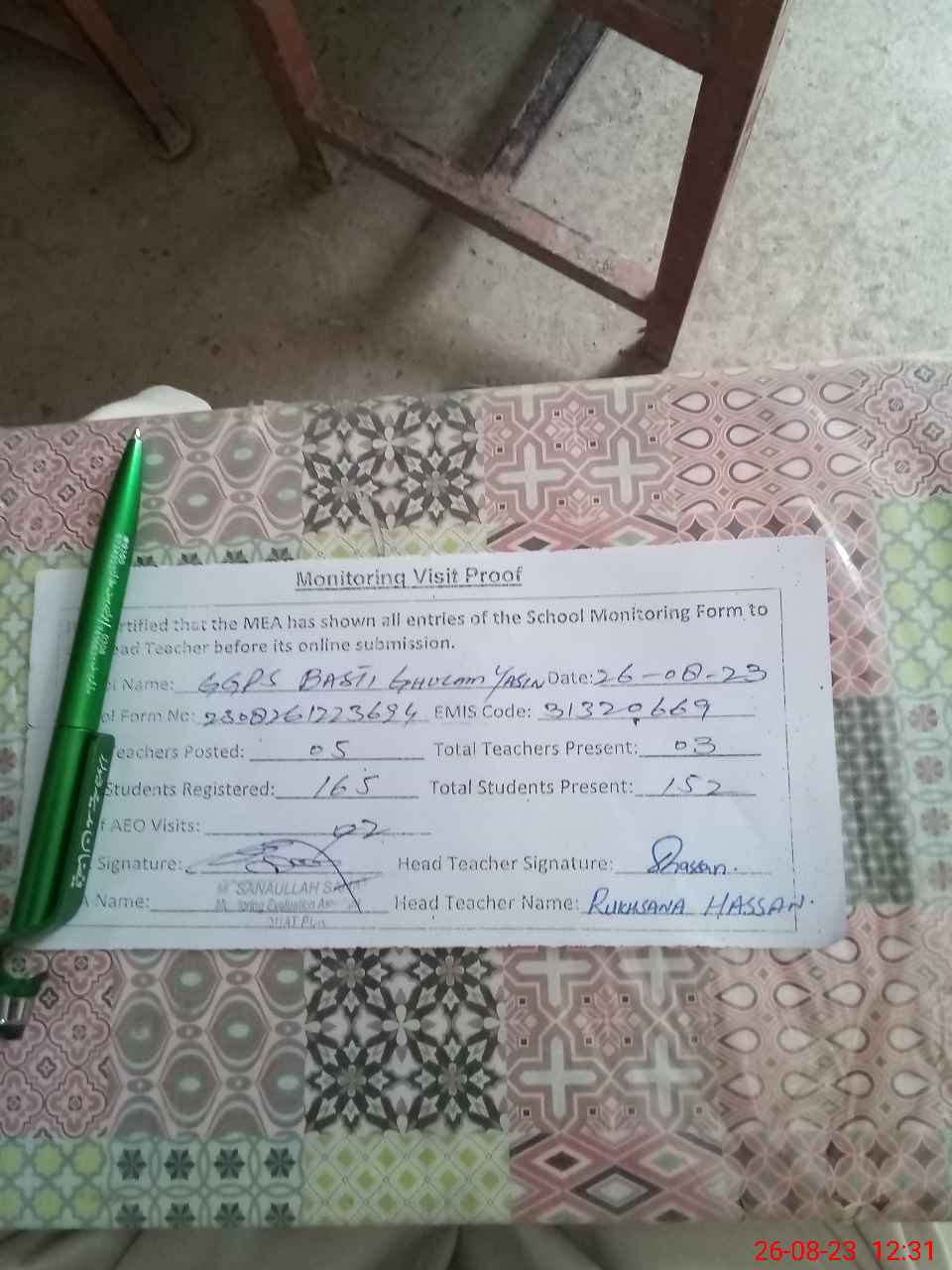 | Monitoring Date: 26-08-2023 | Start Time: 26-08-2023 12:04 PM | End Time: 26-08-2023 12:32 PM | Name of MEA: Mu**** Sa**** Ul**** Sa**** | |