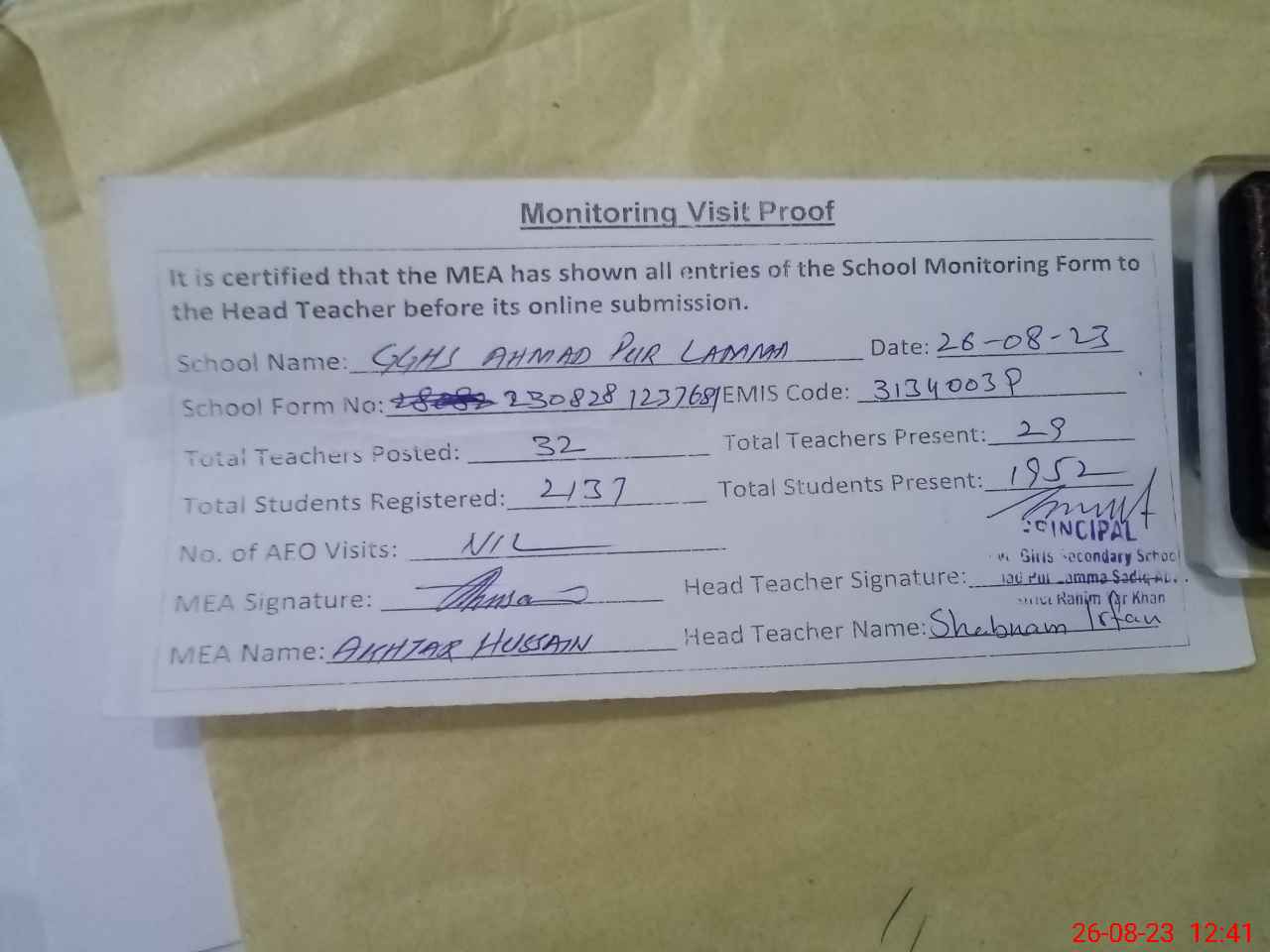 | Certified that this School was Inspected by the Undersigned MEA/DMO Today and the Information Stated Above is as Per Record. | |||||