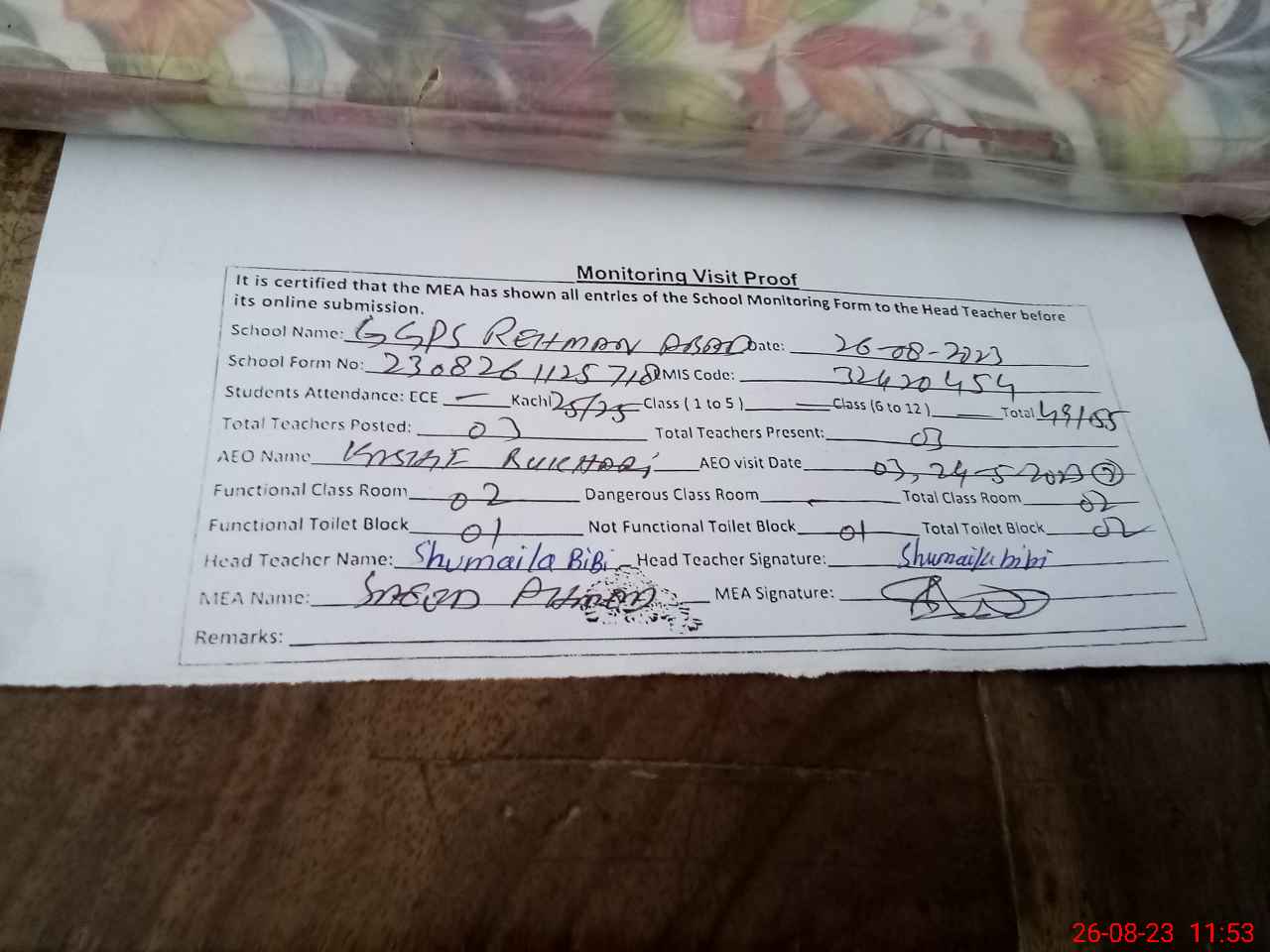 | Attendance Register | Head Teacher | MEA with School | Visit Proof |