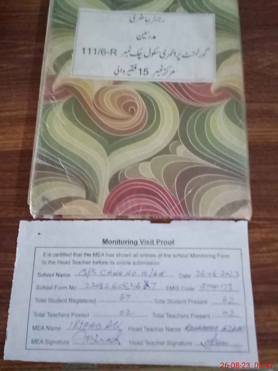 | Attendance Register | Head Teacher | MEA with School | Visit Proof |