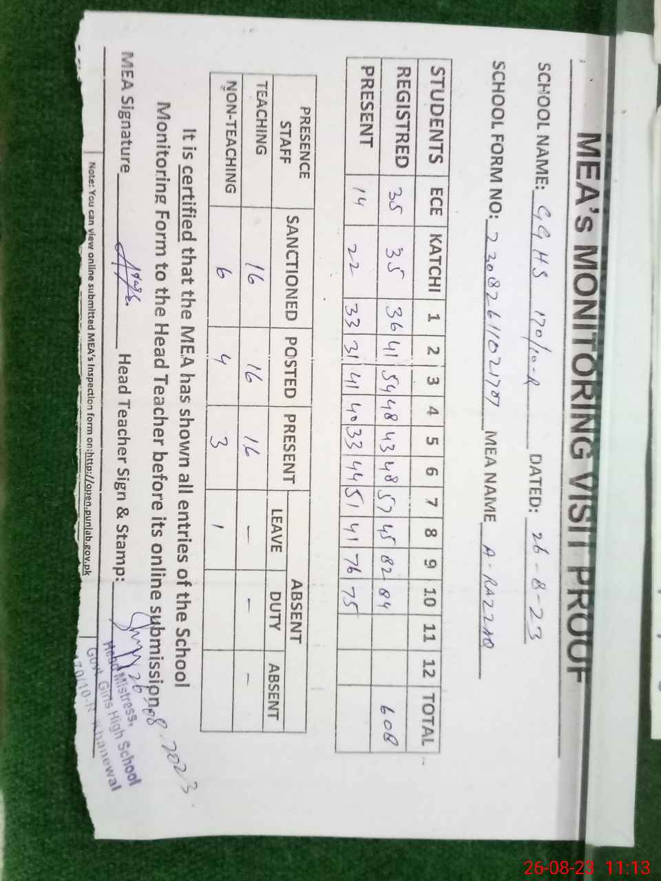 | Attendance Register | Head Teacher | MEA with School | Visit Proof |