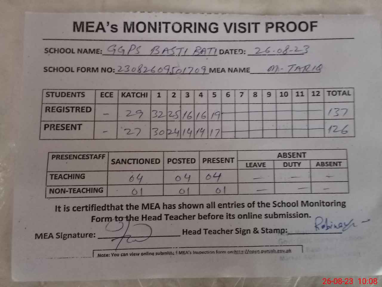 | Attendance Register | Head Teacher | MEA with School | Visit Proof |