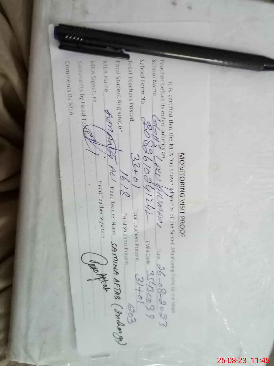 | Attendance Register | Head Teacher | MEA with School | Visit Proof |