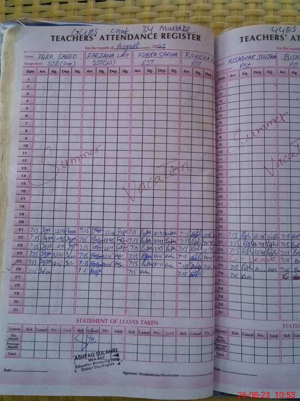| Monitoring Date: 26-08-2023 | Start Time: 26-08-2023 09:05 AM | End Time: 26-08-2023 10:56 AM | Name of MEA: Mu**** As**** | |