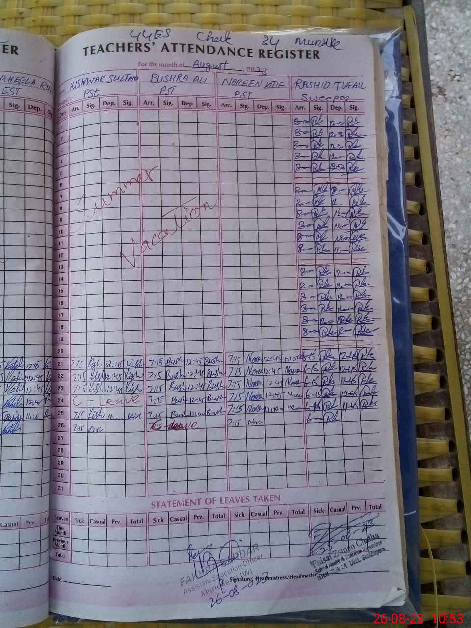 | No. of Students Present - Male | 3 | 0 | 5 | 2 | 5 | 0 | 3 | 4 | 0 | 2 | 2 | 26 | ||||