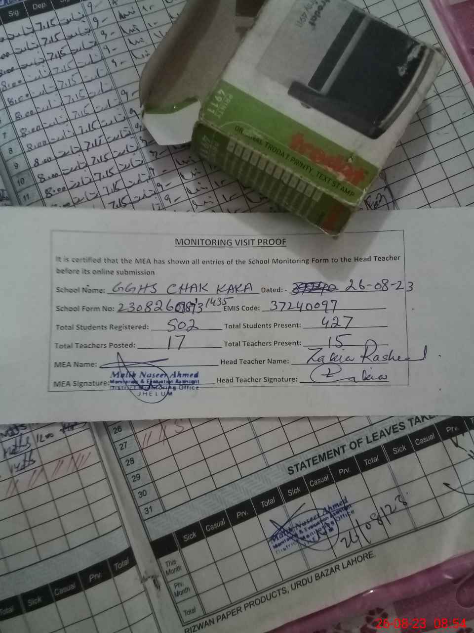 | Attendance Register | Head Teacher | MEA with School | Visit Proof |