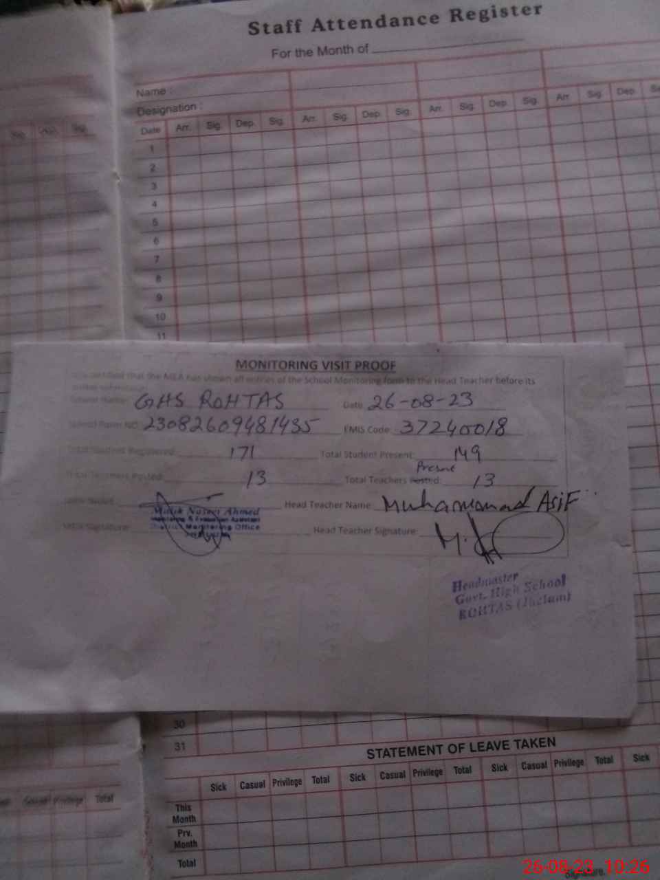 | Attendance Register | Head Teacher | MEA with School | Visit Proof |