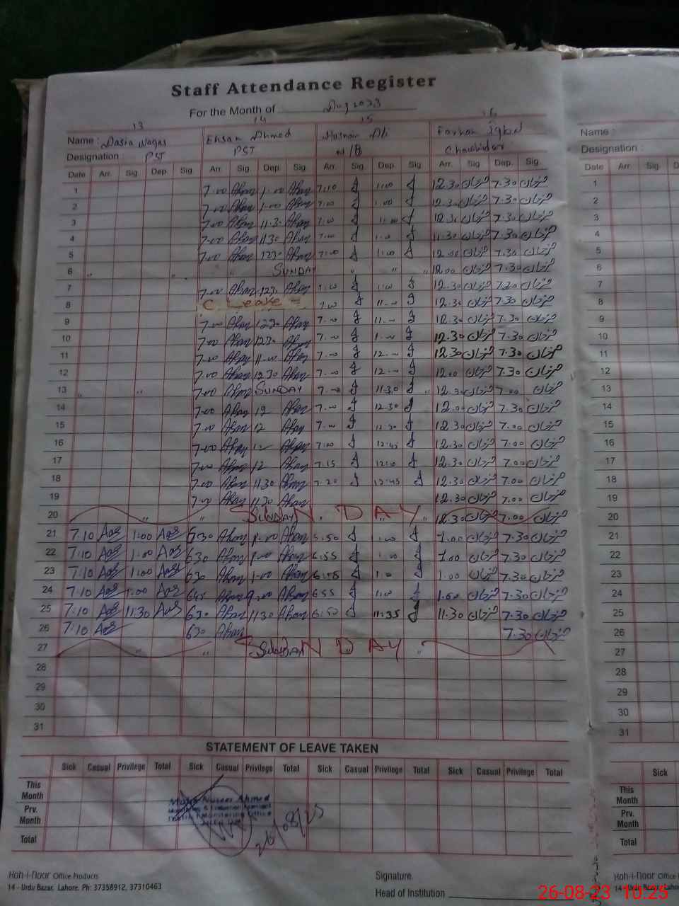 | CNIC | Full Name | Designation | R/C | Absence During Last Calender Month |