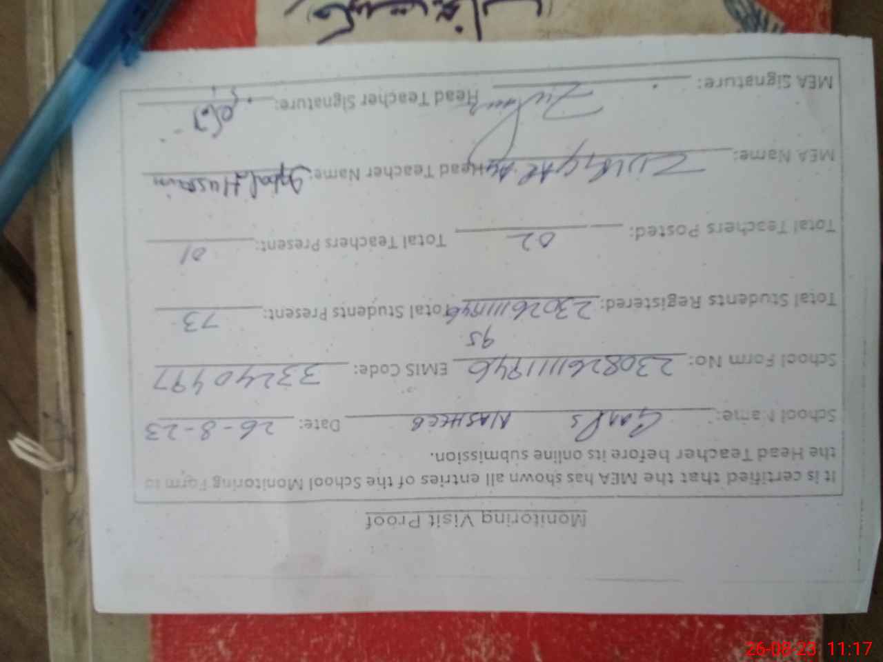 | Attendance Register | Head Teacher | MEA with School | Visit Proof |