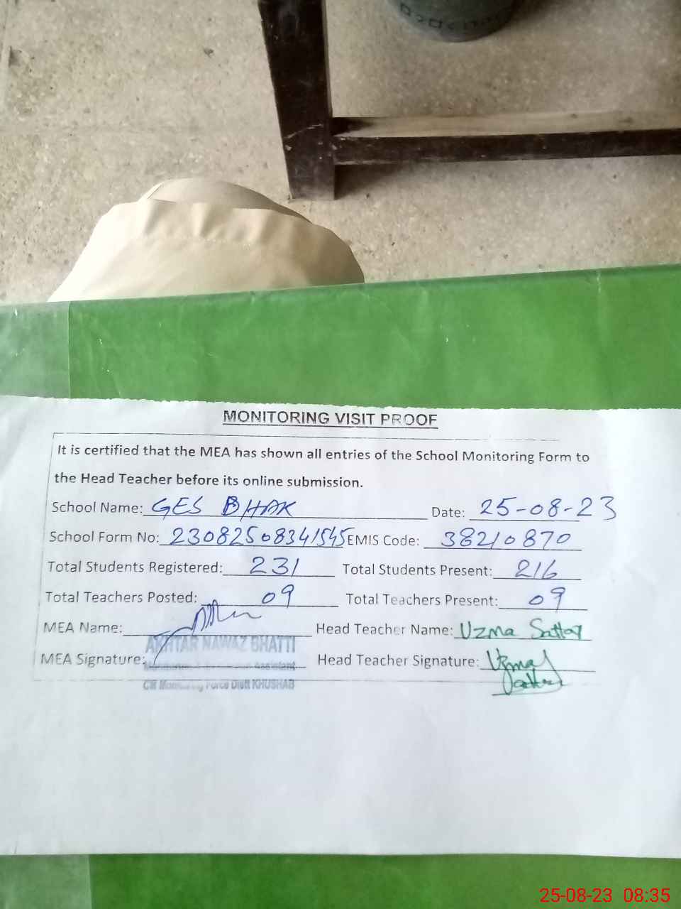 | Attendance Register | Head Teacher | MEA with School | Visit Proof |