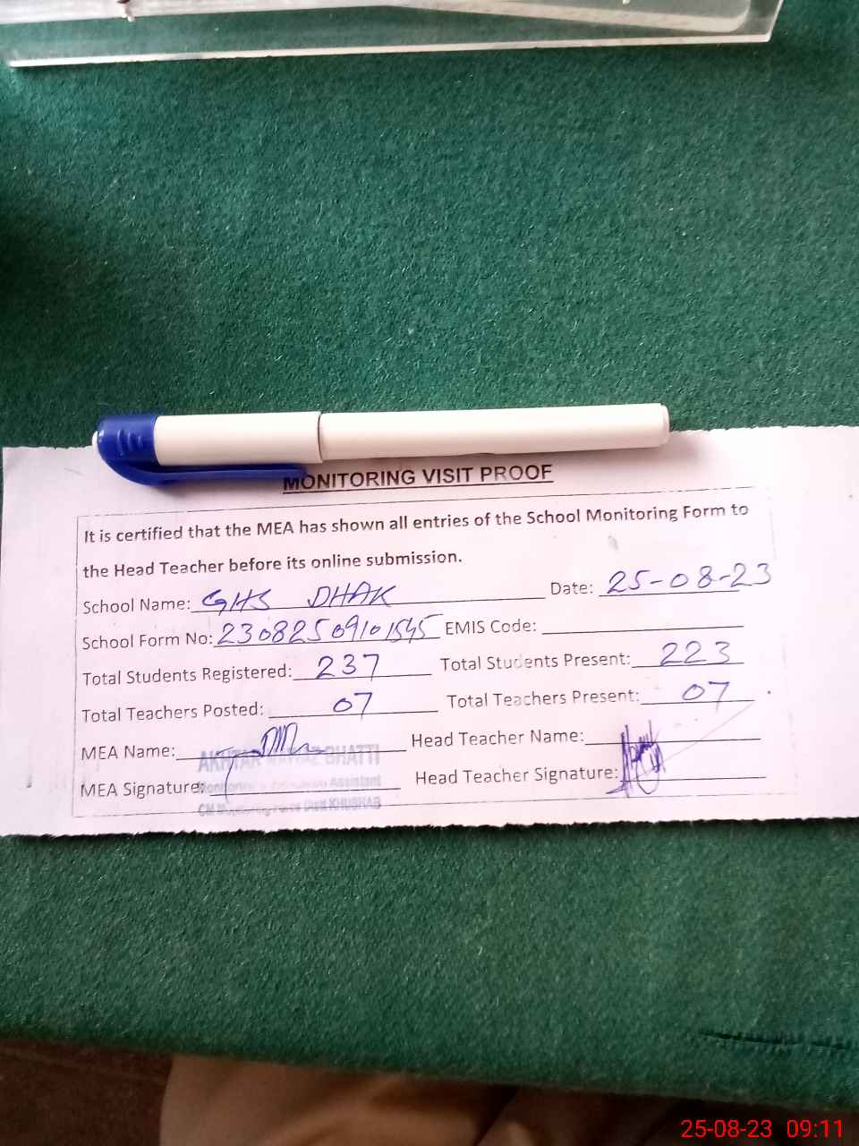 | Attendance Register | Head Teacher | MEA with School | Visit Proof |
