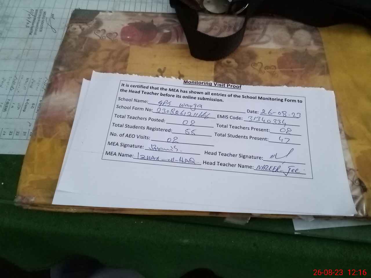 | Attendance Register | Head Teacher | MEA with School | Visit Proof |