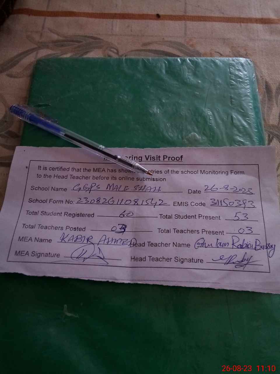| Attendance Register | Head Teacher | MEA with School | Visit Proof |