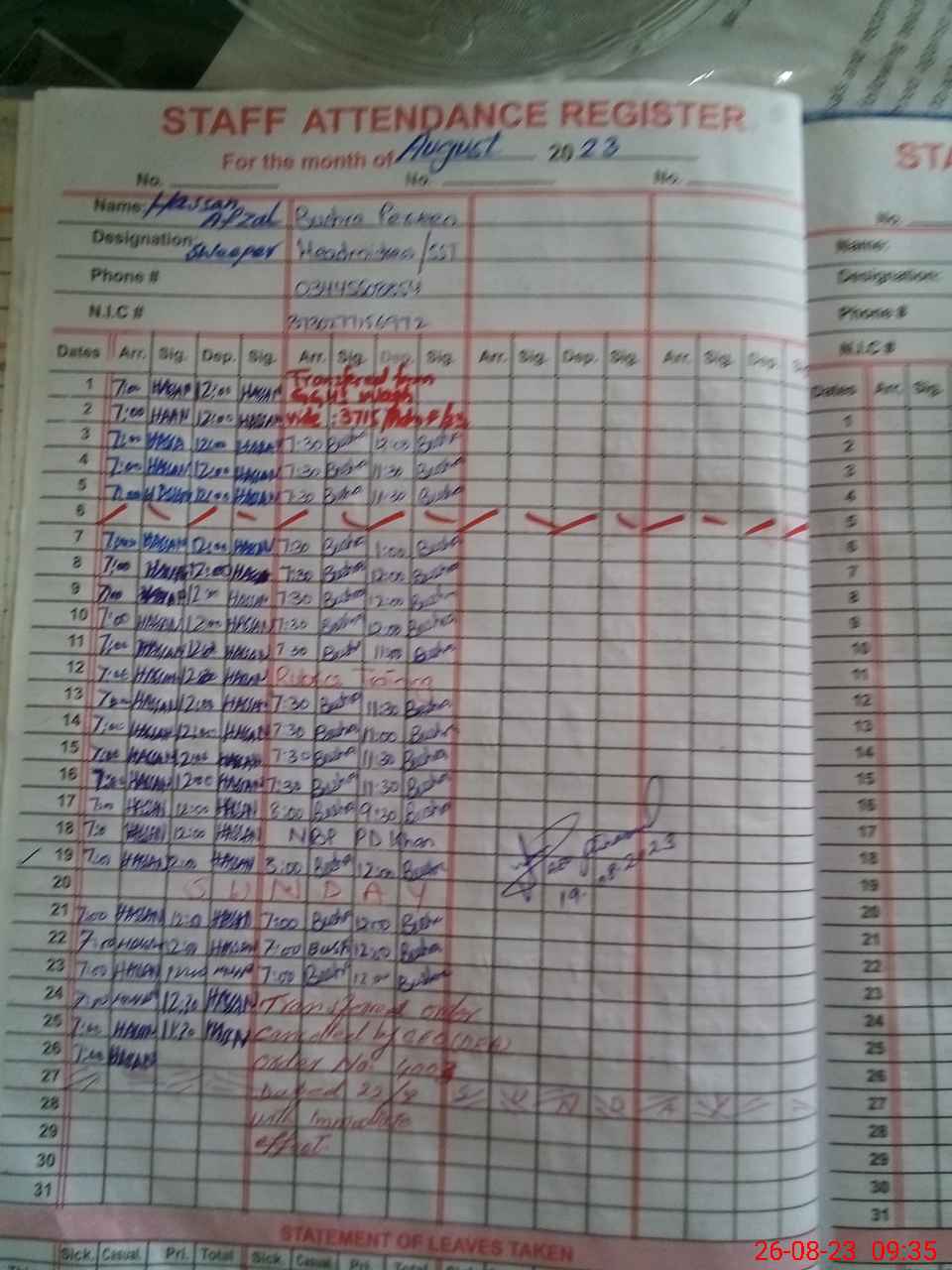 | CNIC | Full Name | Designation | R/C | Absence during last cal. month |