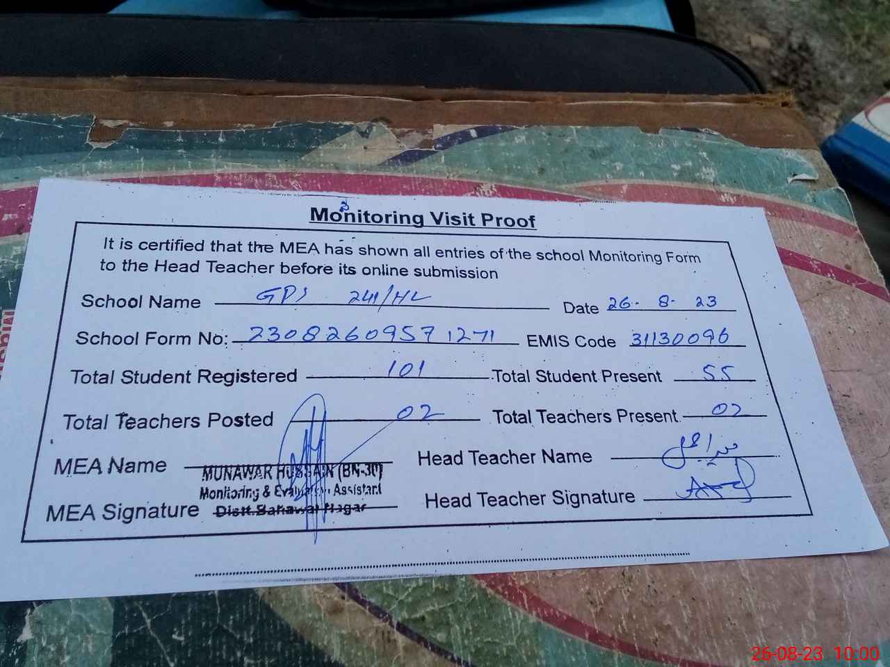| Attendance Register | Head Teacher | MEA with School | Visit Proof |