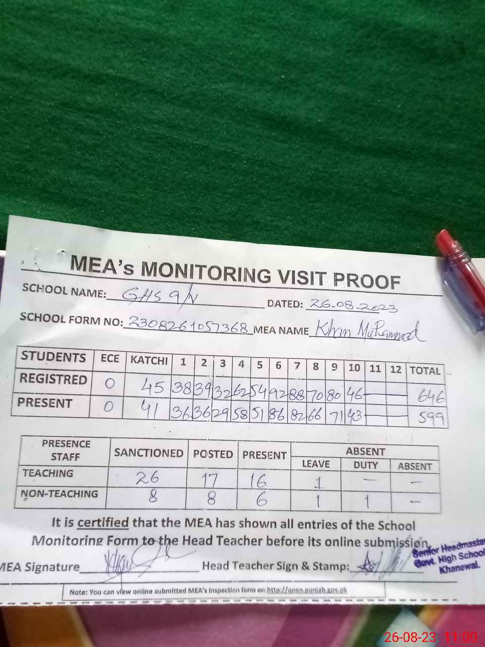 | EMIS Code: 36420008 | Name of School: GHS 9/V, KHANEWAL | |||