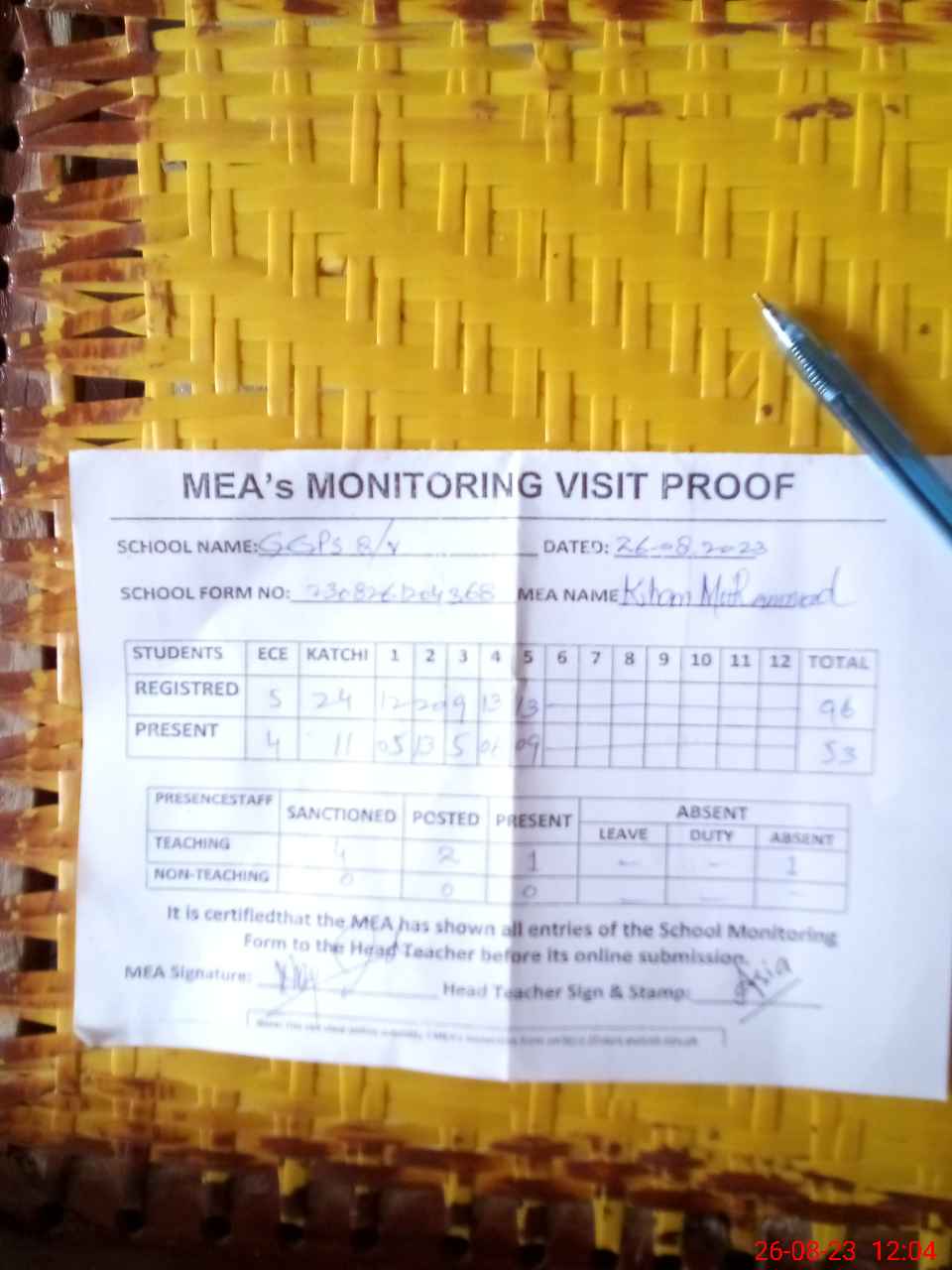 | Attendance Register | Head Teacher | MEA with School | Visit Proof |