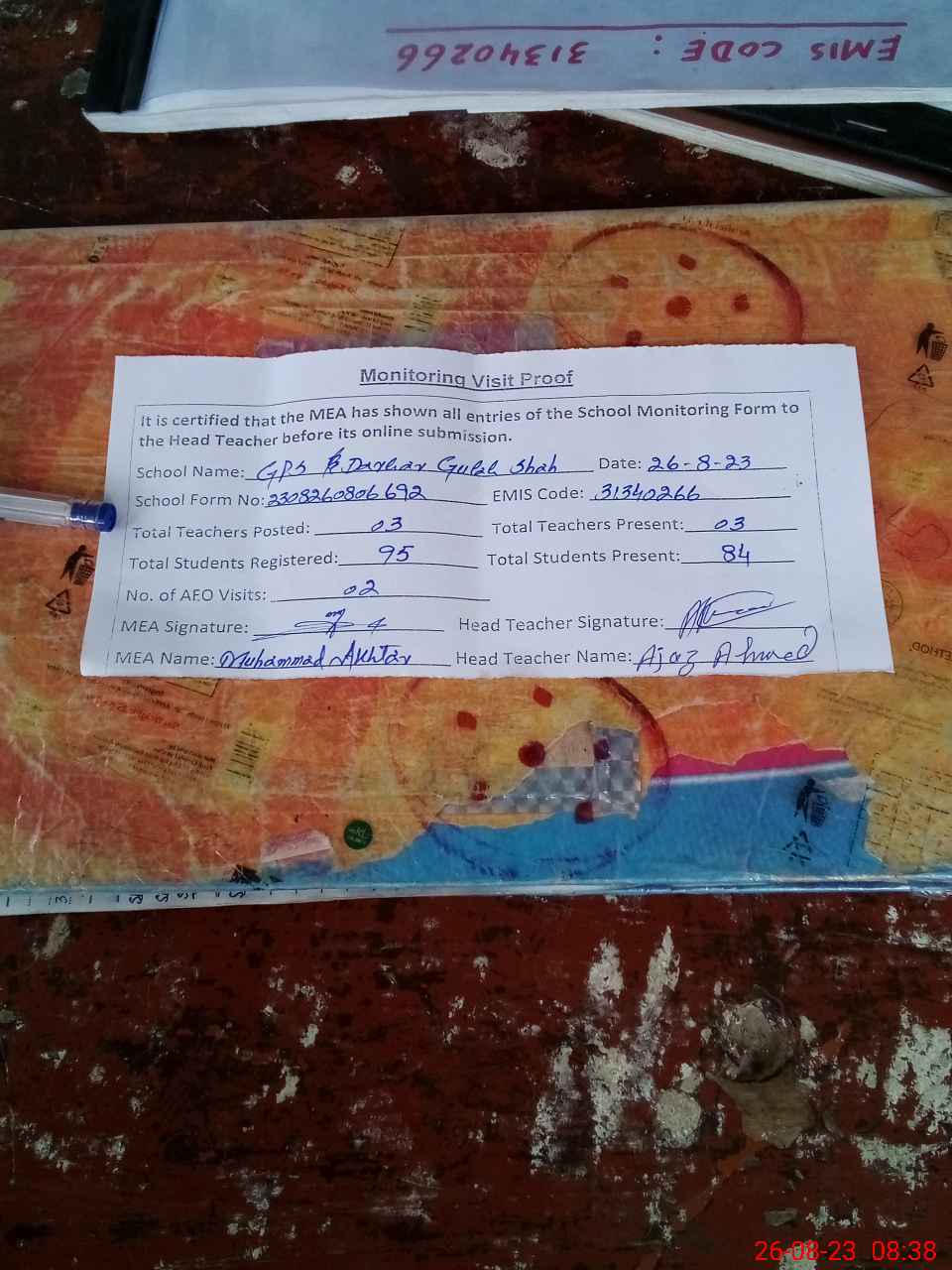 | Attendance Register | Head Teacher | MEA with School | Visit Proof |