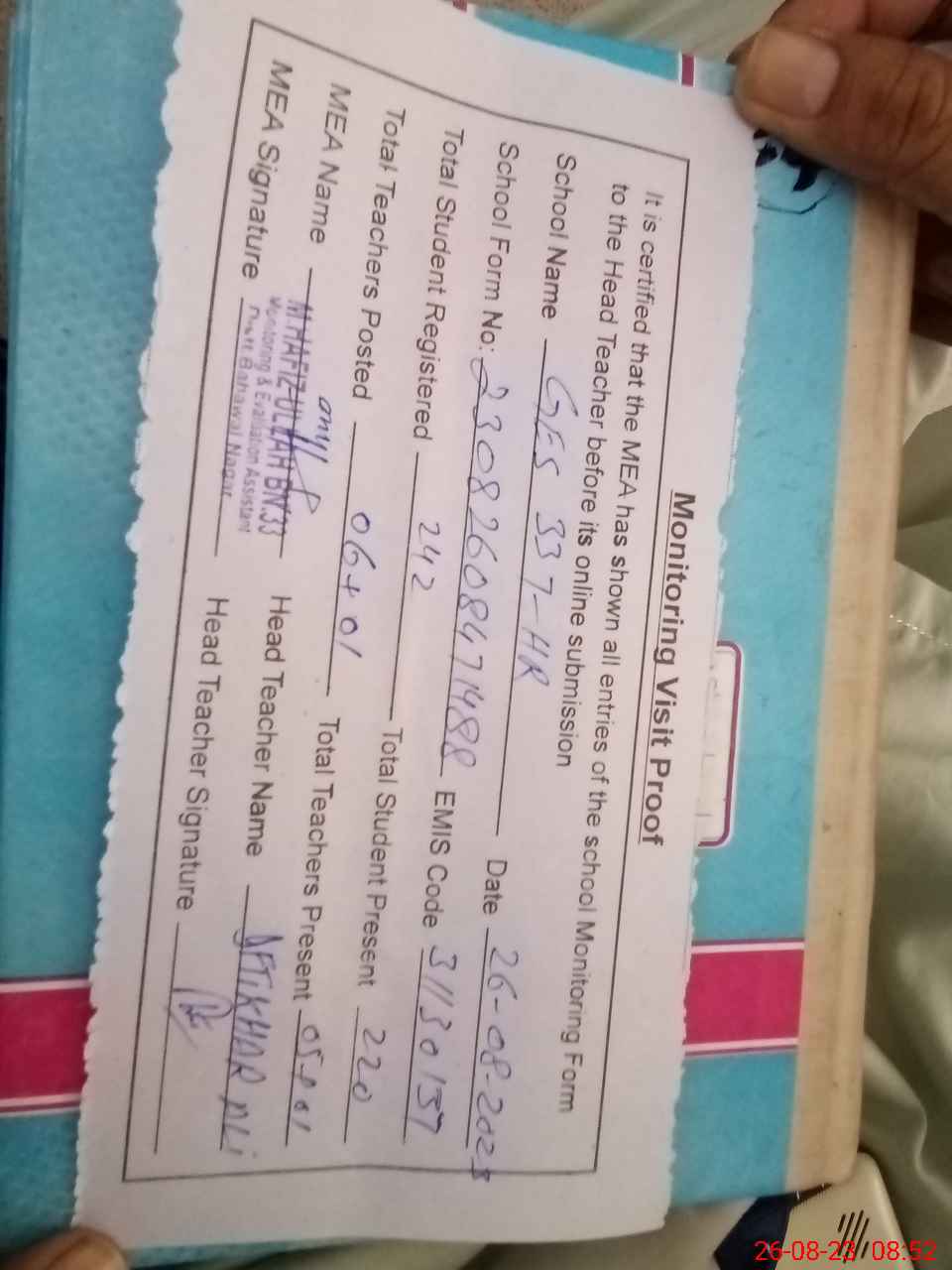 | Attendance Register | Head Teacher | MEA with School | Visit Proof |