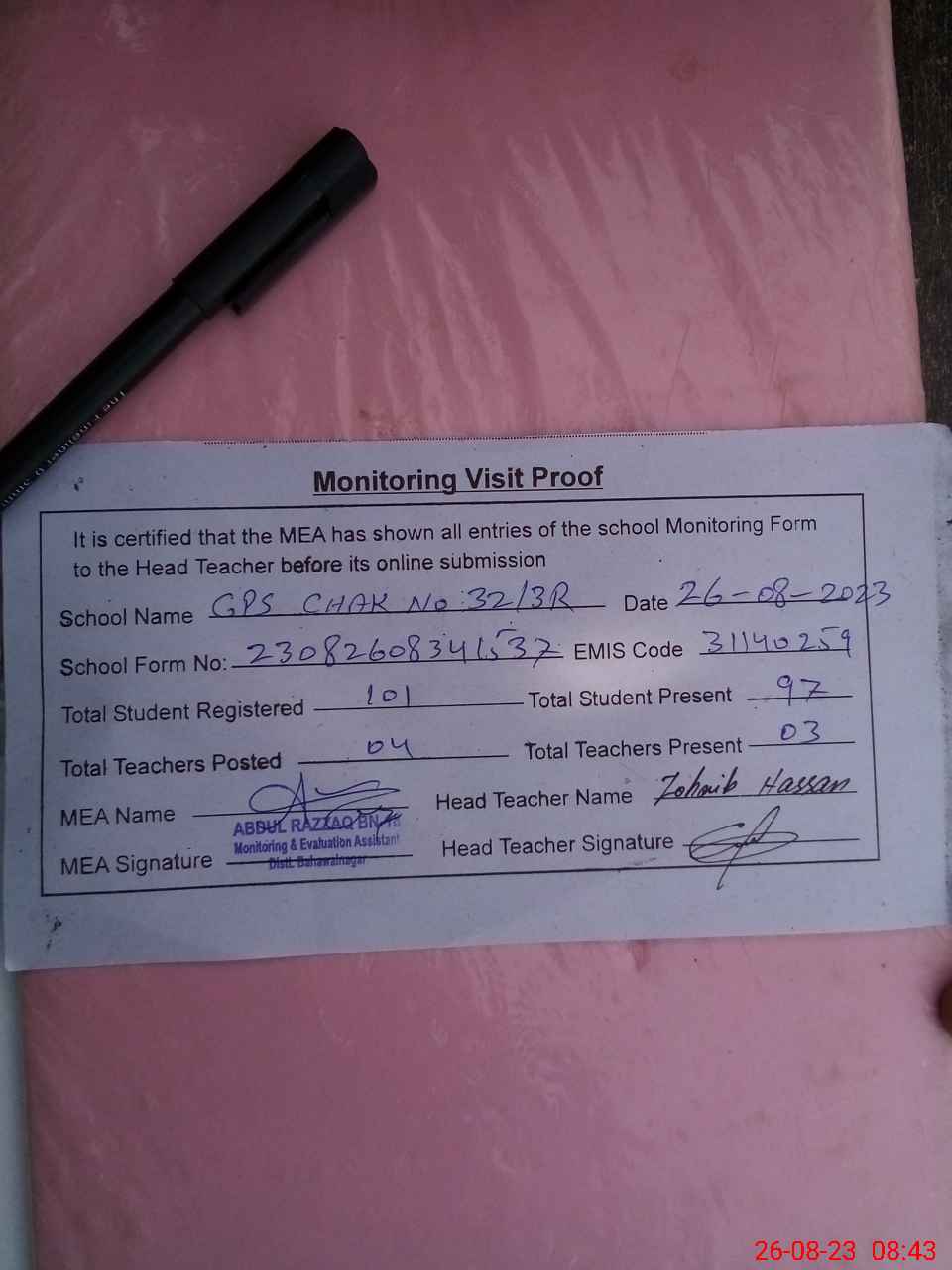 | Attendance Register | Head Teacher | MEA with School | Visit Proof |
