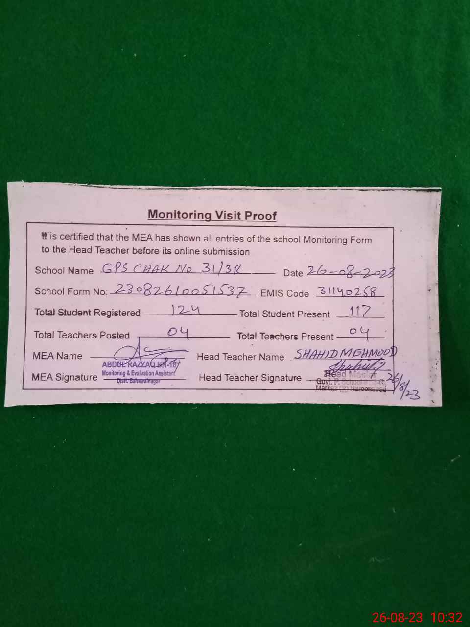 | EMIS Code: 31140258 | Name of School: GPS CHAK NO.31/3-R | |||
