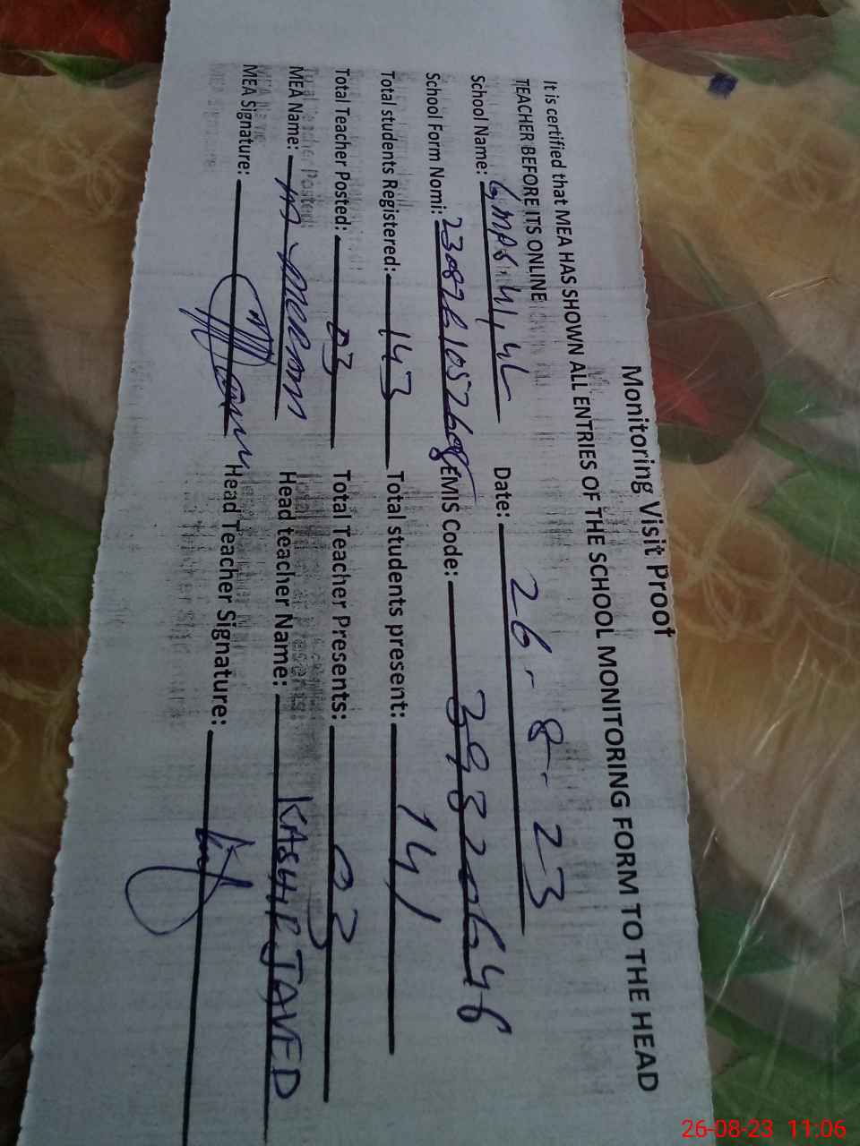 | Attendance Register | Head Teacher | MEA with School | Visit Proof |