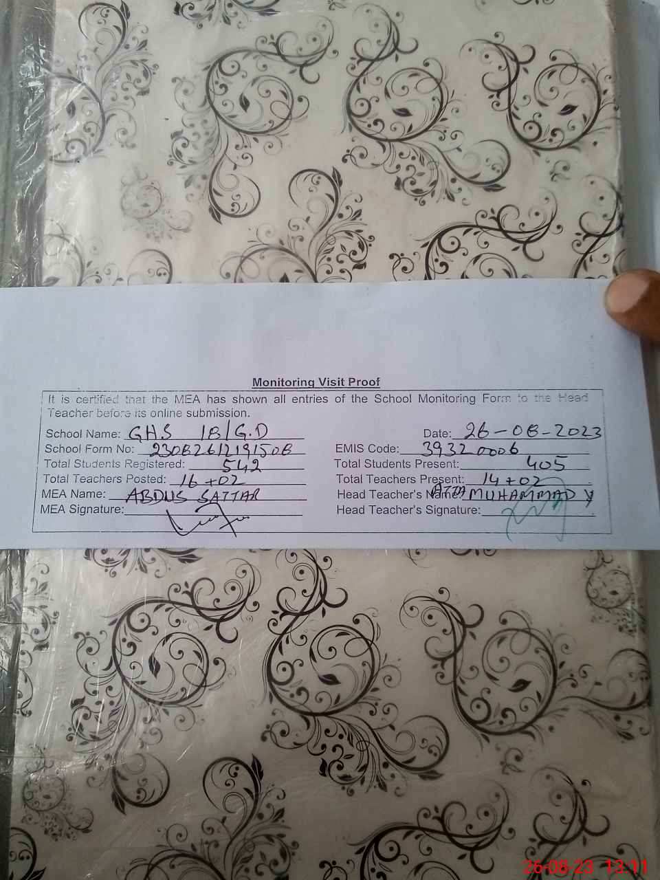 | Attendance Register | Head Teacher | MEA with School | Visit Proof |