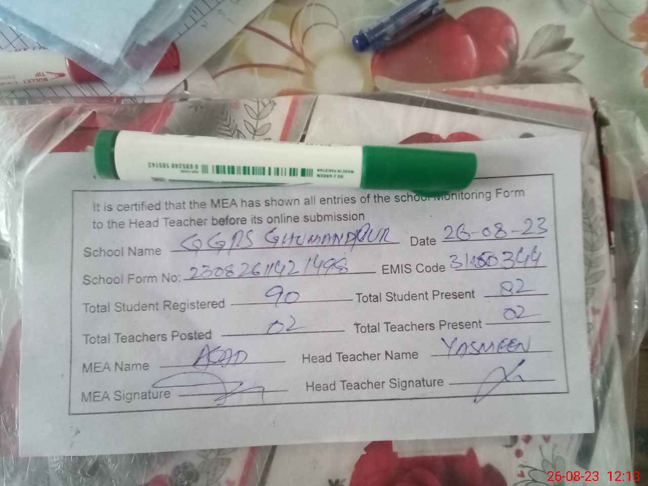 | Attendance Register | Head Teacher | MEA with School | Visit Proof |