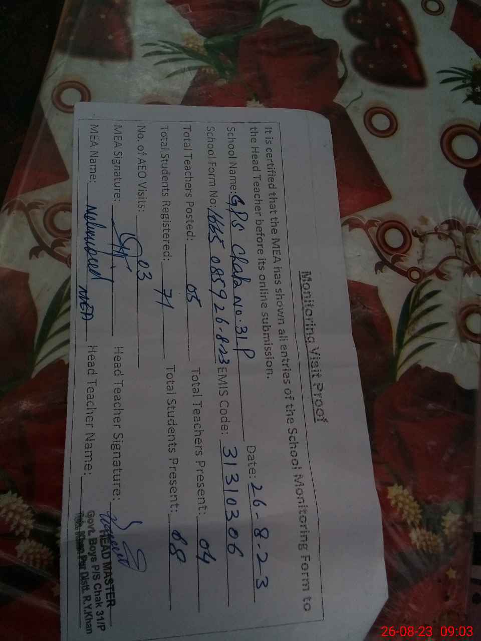 | EMIS Code: 31310306 | Name of School: GPS CHAK NO. 31/P. P.O. BAGHO BEHAR | |||