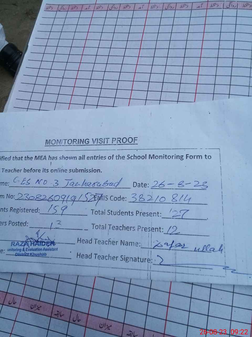 | Attendance Register | Head Teacher | MEA with School | Visit Proof |
