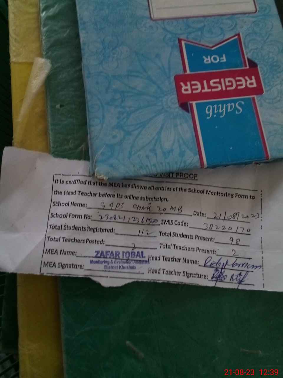 | Attendance Register | Head Teacher | MEA with School | Visit Proof |