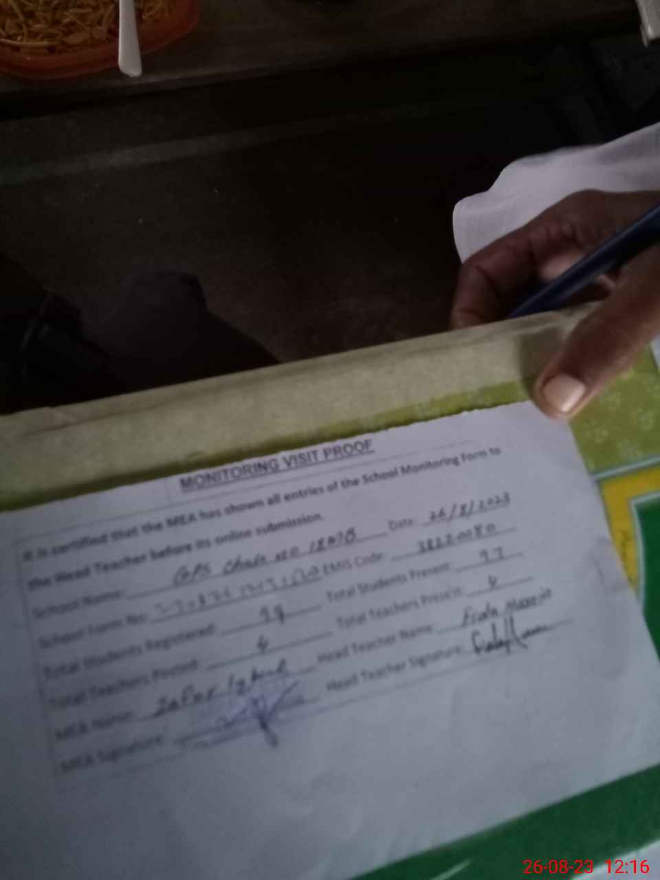 | Attendance Register | Head Teacher | MEA with School | Visit Proof |