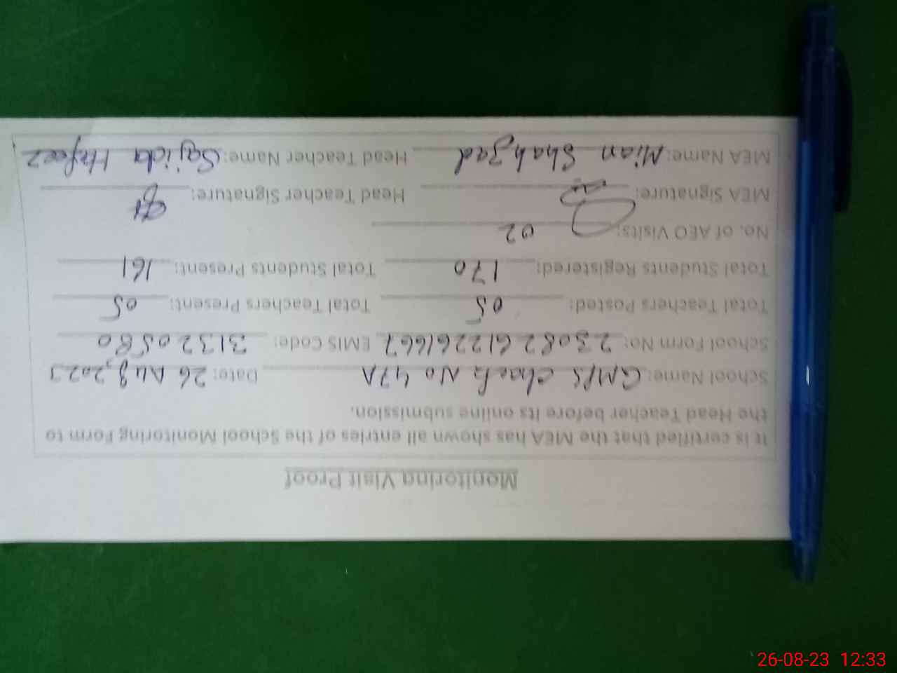 | Attendance Register | Head Teacher | MEA with School | Visit Proof |