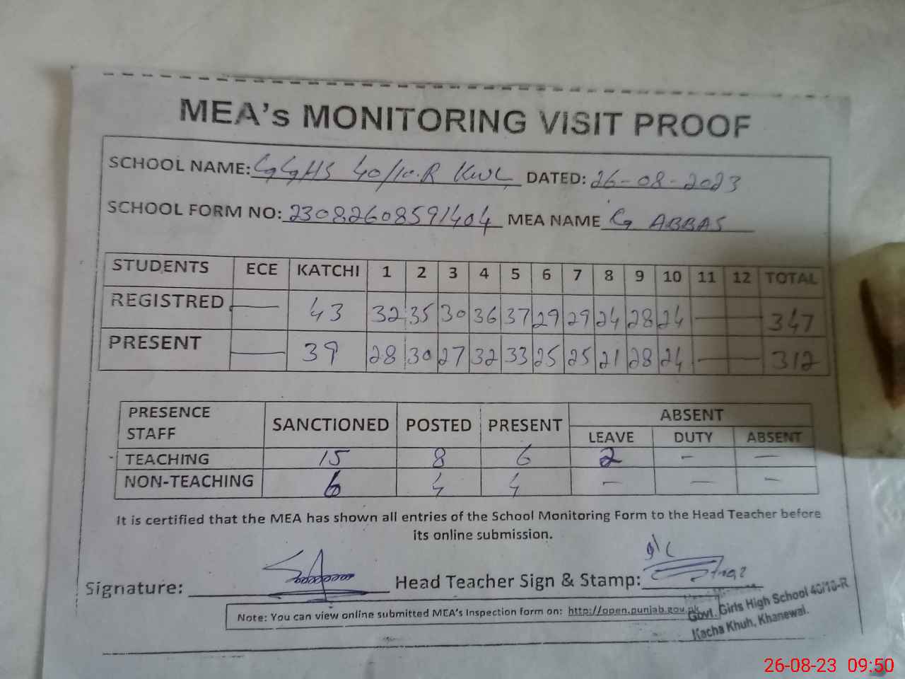| Attendance Register | Head Teacher | MEA with School | Visit Proof |