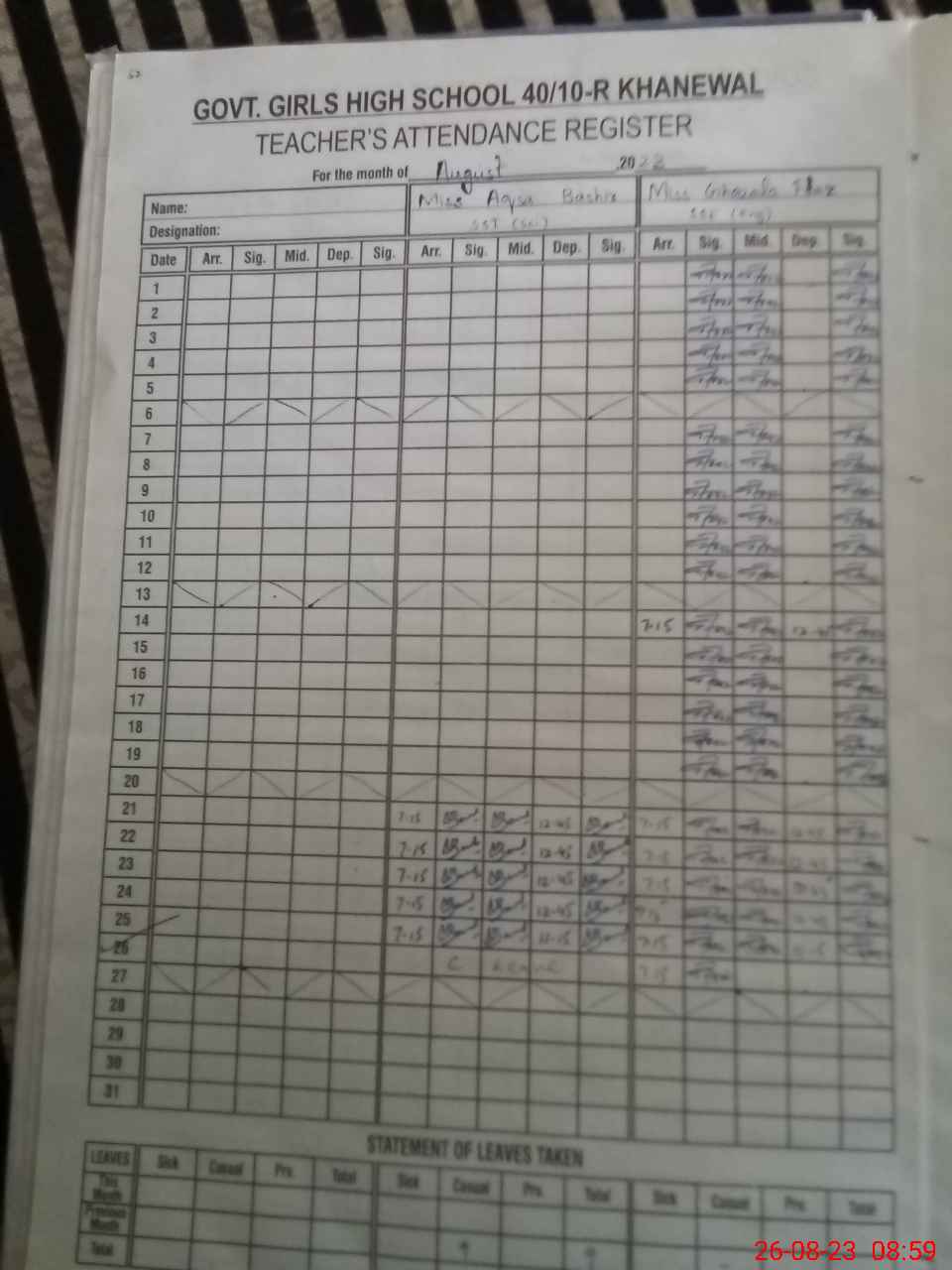 | Monitoring Date: 26-08-2023 | Start Time: 26-08-2023 08:22 AM | End Time: 26-08-2023 09:52 AM | Name of MEA: GH**** AB**** | |