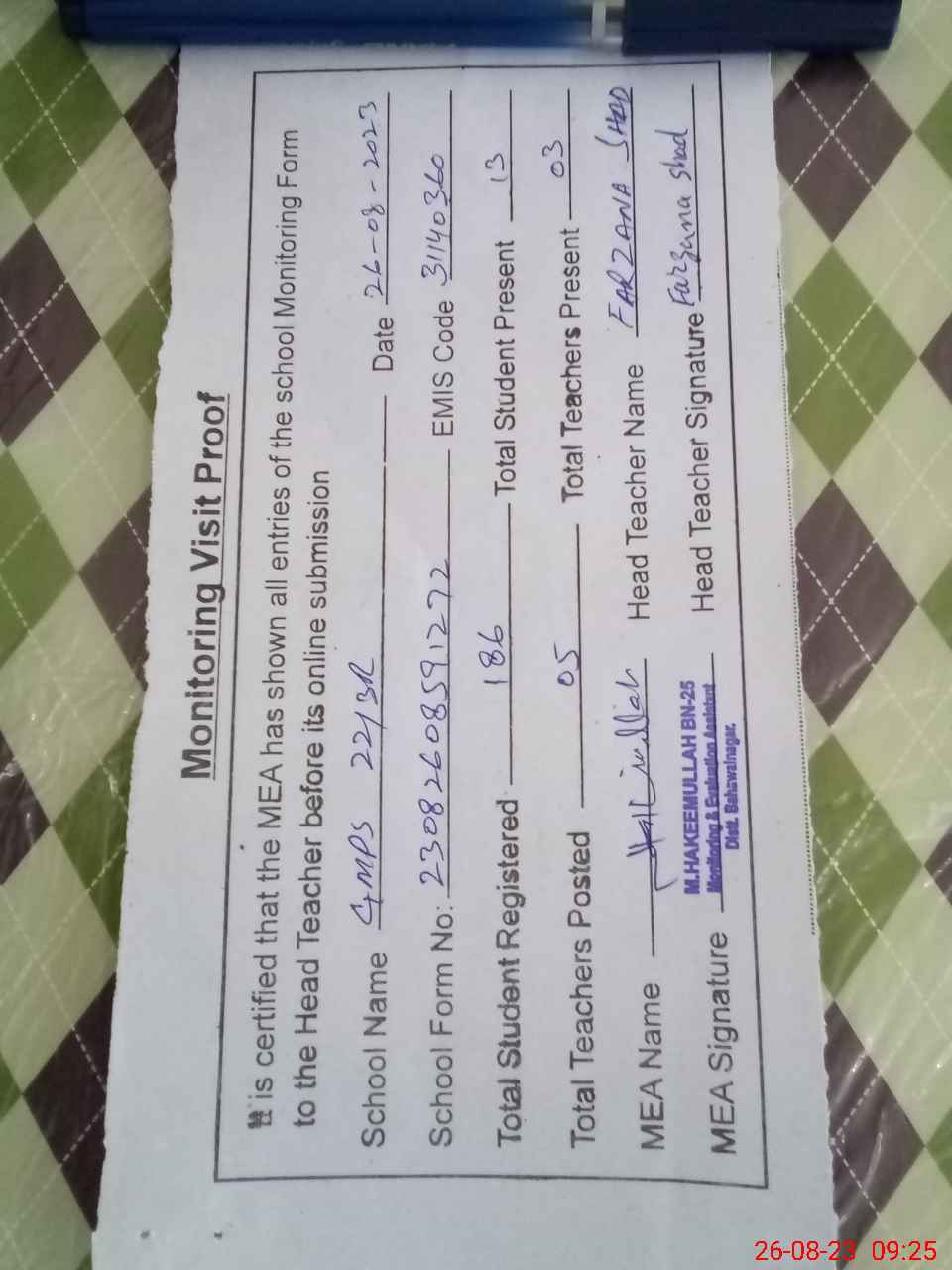 | Monitoring Date: 26-08-2023 | Start Time: 26-08-2023 08:31 AM | End Time: 26-08-2023 09:26 AM | Name of MEA: Mu**** ha**** ul**** BN25 | |