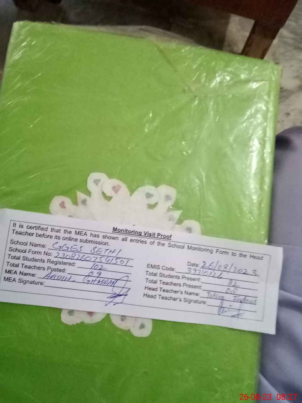 | Attendance Register | Head Teacher | MEA with School | Visit Proof |