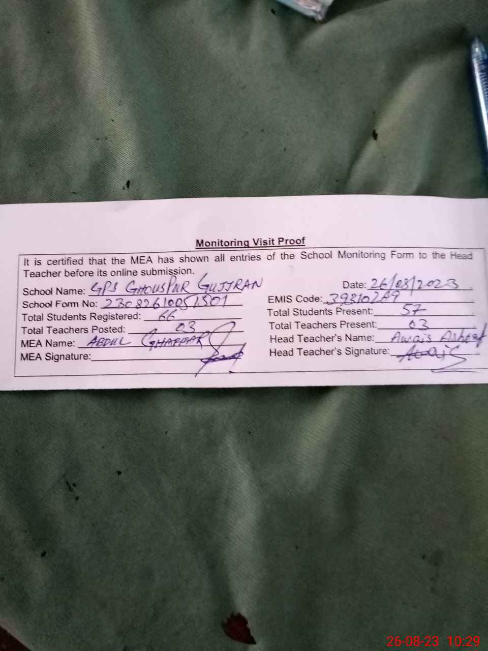 | EMIS Code: 39310269 | Name of School: GPS GHOUS PUR GUJJRAN (GHATTAY PHAKNI) | |||