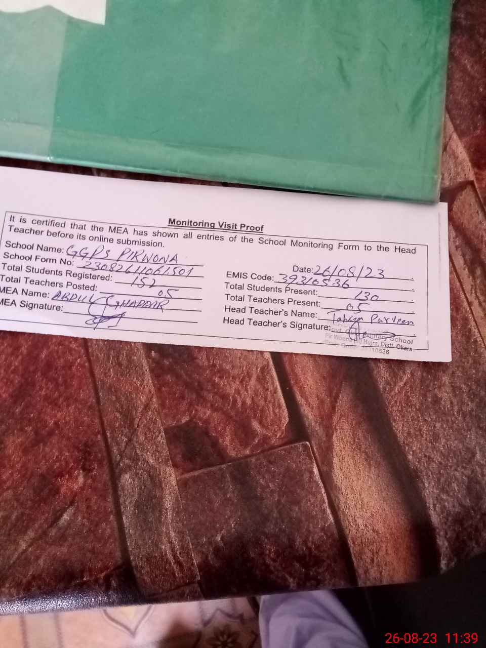 | Attendance Register | Head Teacher | MEA with School | Visit Proof |