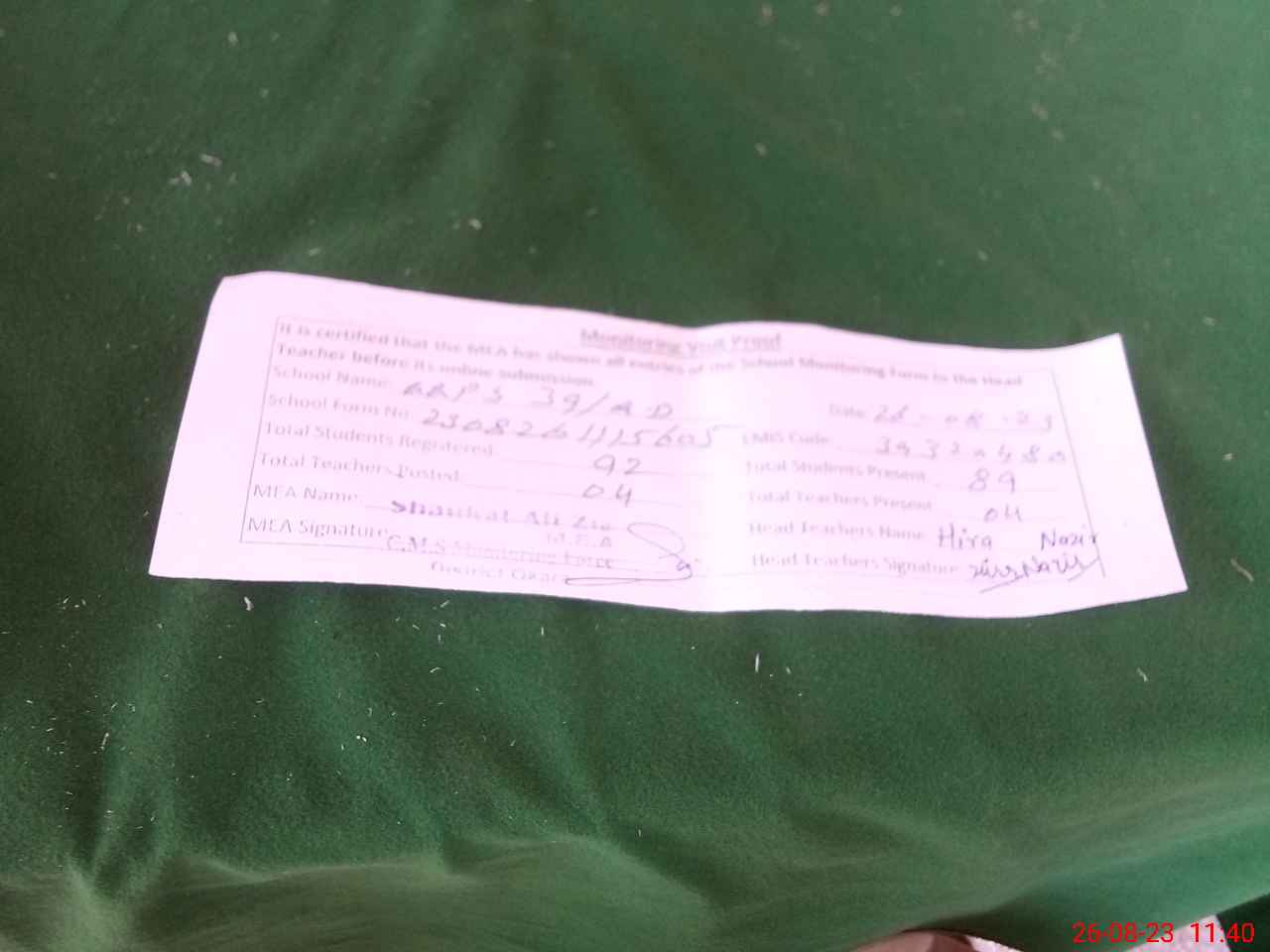 | Monitoring Date: 26-08-2023 | Start Time: 26-08-2023 11:15 AM | End Time: 26-08-2023 11:41 AM | Name of MEA: SH**** AL**** ZI**** (R**** | |