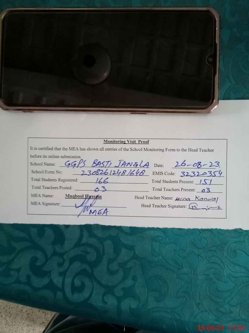 | Certified that this School was Inspected by the Undersigned MEA/DMO Today and the Information Stated Above is as Per Record. | |||||