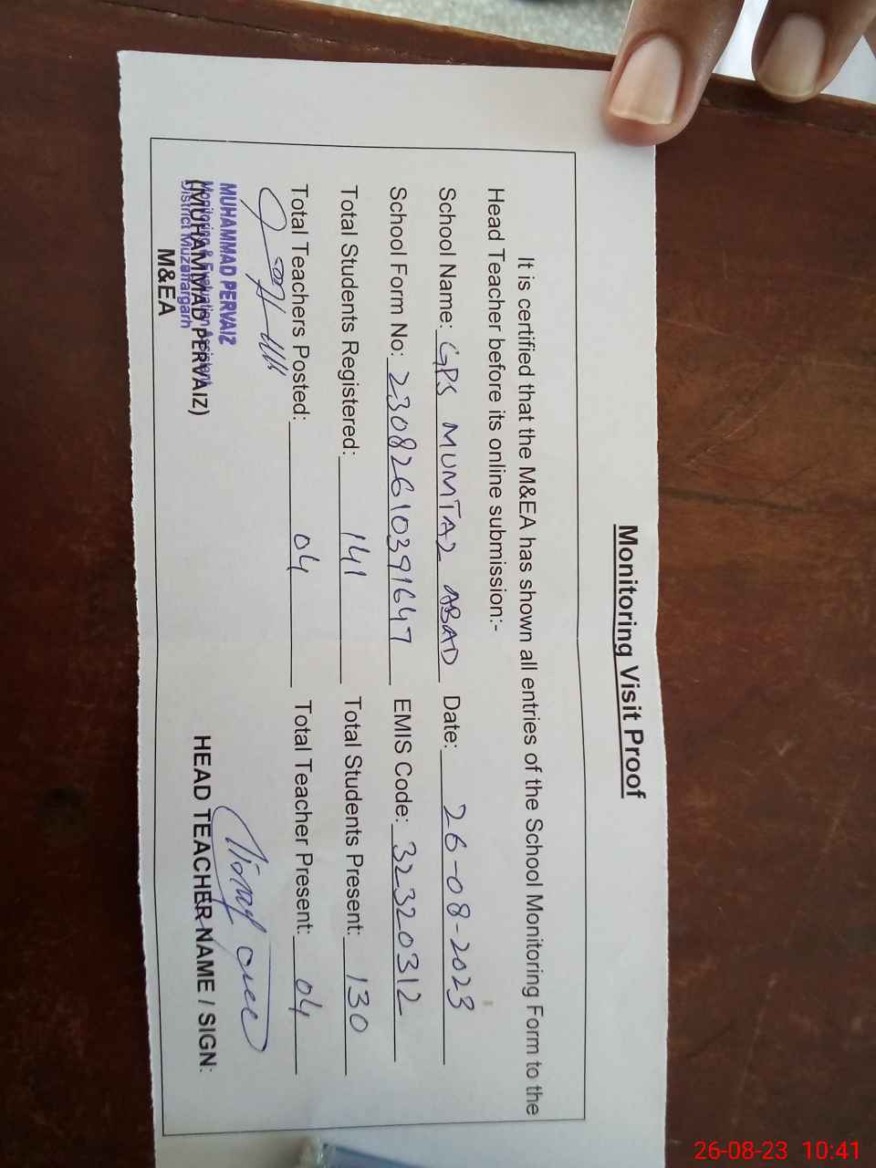 | EMIS Code: 32320312 | Name of School: GPS MUMTAZ WALA | |||