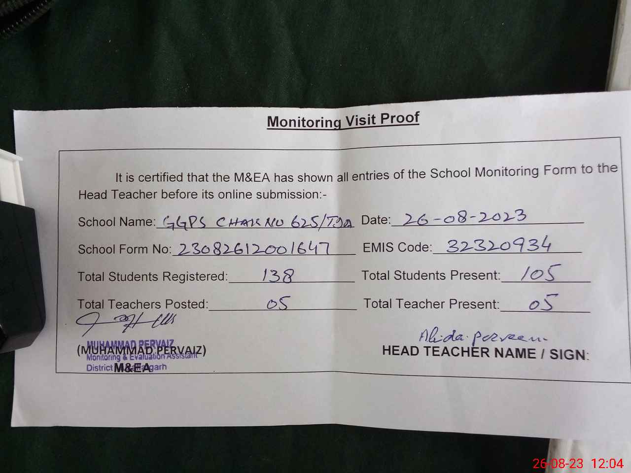 | Attendance Register | Head Teacher | MEA with School | Visit Proof |